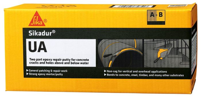 Sika Sikadur UA is a solvent free, non slump, two component epoxy resin patching mortar, containing blended high strength fillers. When mixed it has a soft putty like consistency making it ideal for, sealing plastic penetration pipes and fittings to concrete, general patching and repair work.